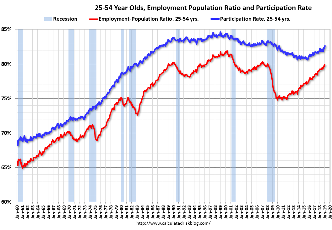 Only the second Clinton administration had an employment to population ratio materially higher than today. The participation rates is still perhaps 1 pp below where it might be otherwise.