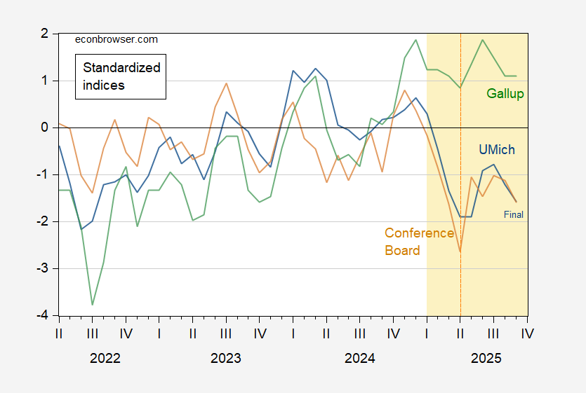 Figure 1: U.Michigan Economic Sentiment (blue), Conference Board Confidence Index (brown), Gallup Confidence (green), all demeaned and divided by standard deviation 2021M01-2025m02. Red dashed line at “Liberation Day” Source: UMichigan, Gallup, Conference Board, and author’s calculations.
