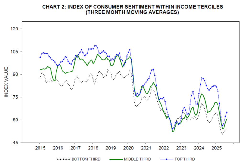 Confidence is lowest in the lowest income tercile, and highest in the highest tercile, which accounts for most of the consumption spending. In other words, a population weighted sentiment index doesn’t mecessarily match up with a dollar-weighted consumption metric.