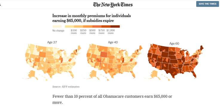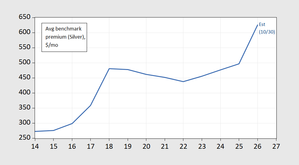 Figure 1: Average benchmark ACA premium (Silver plan, 40yr old), $/mo (blue). Note there is wide dispersion in plan premia given different states, demographics, income. Source: KFF, accessed 10/30/2025.