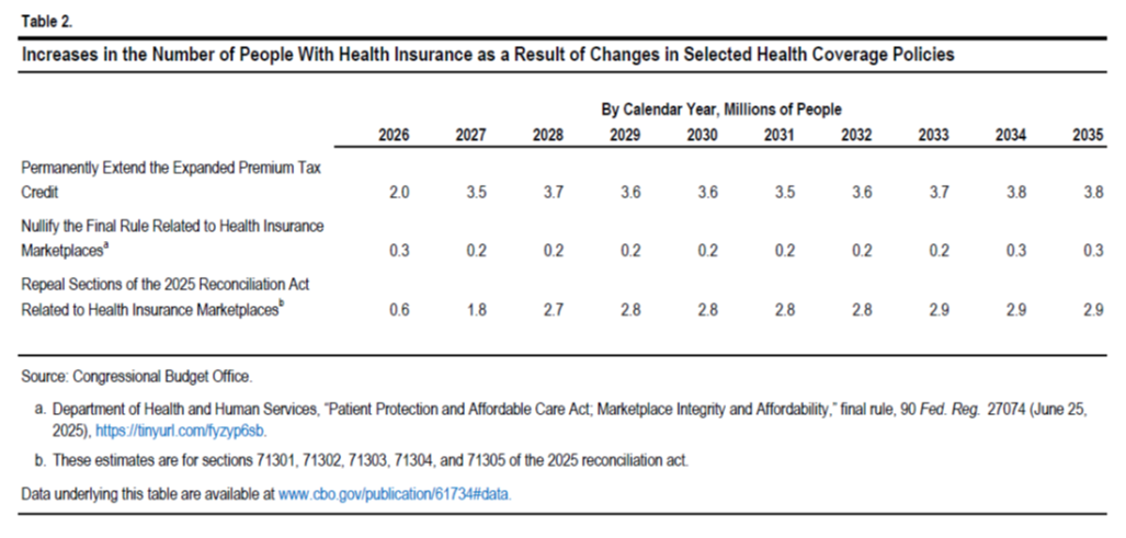 As noted in the CBO letter, in 2026 (2027), 2 (3.5) million more people would be covered by permanently extending the expanded premium tax credit, relative to not.