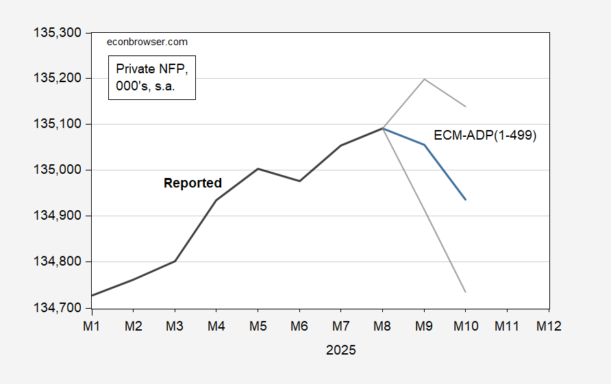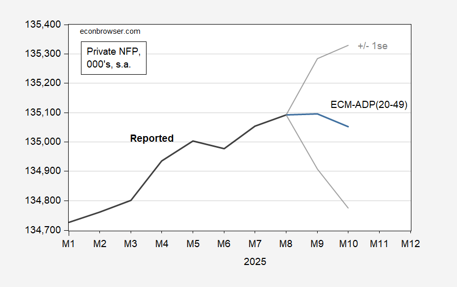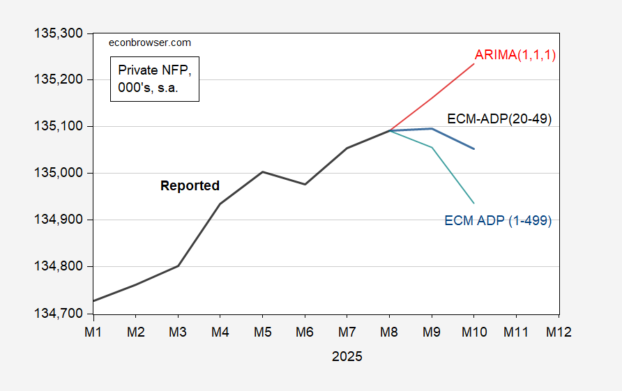 I estimated three models, 2021-2025M08, resulting in adjusted R2 of between 0.54 (based on ADP data) to 0.71 (based on ADP data). Here’s what I got for forecasts of September and October private NFP as reported by BLS: