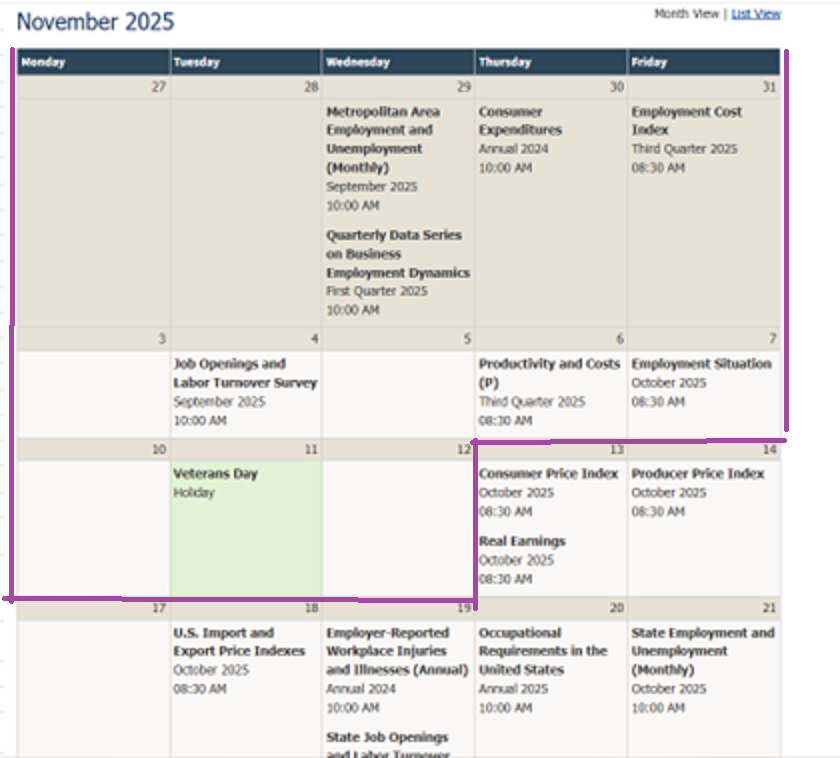 Per Kalshi, on 10/18 noon CT. At this rate, we miss Metro area Employment/Unemployment, Consumer Expenditures, Employment Cost Index, Business Employment Dynamics, September JOLTS, Productivity and Costs, October Employment Situation releases on their scheduled dates.