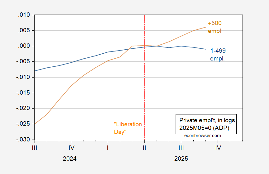 Figure 2: Employment in firms with less than 500 employees (blue), in firms with 500 and more employees (tan), in logs 2025M05=0. Source: ADP via FRED, and author’s calculations.