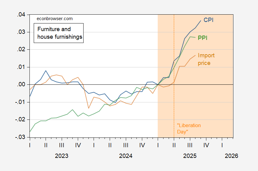 M Smith (Bloomberg) notes that private sector measures of durables indicate comparable (slightly higher) rates of inflation, consistent with tariffs having a measurable impact. Not that we needed such confirmation for such things as furniture.