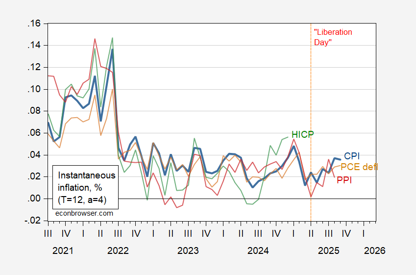 Figure 1: Instantaneous inflation for CPI (bold blue), PCE deflator (tan), HICP (green), and PPI (red), per Eeckhout (2023), T=12, a=4. PCE deflator September observation is Cleveland Fed y/y nowcast of 10/25. Source: BLS, BEA via FRED, Cleveland Fed, and author’s calculations.