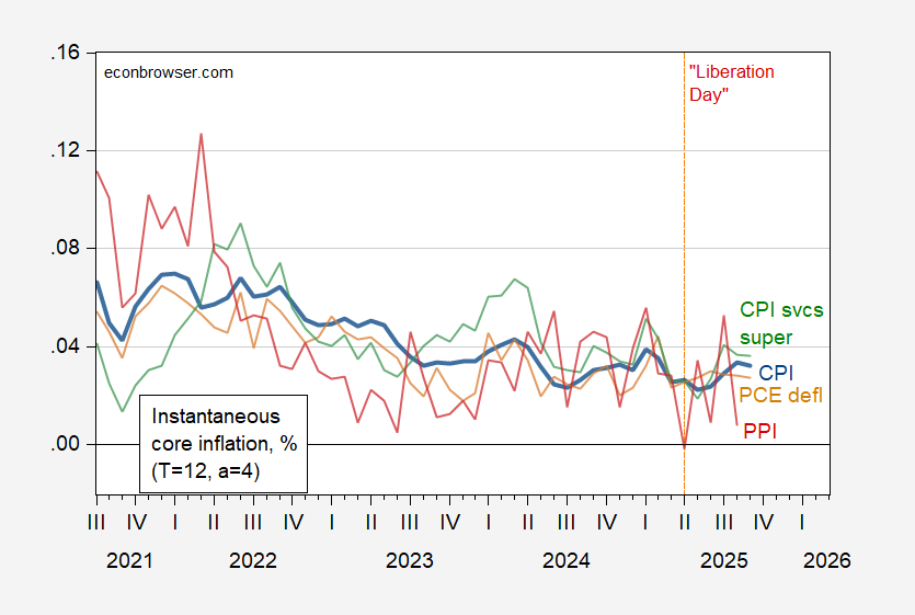 Figure 2: Instantaneous inflation for core CPI (bold blue), core PCE deflator (tan), services supercore CPI (green), PPI core (red), per Eeckhout (2023), T=12, a=4. PCE deflator September observation is Cleveland Fed y/y nowcast of 10/25. Source: BLS, BEA via FRED, Cleveland Fed, Paweł Skrzypczyński, and author’s calculations.