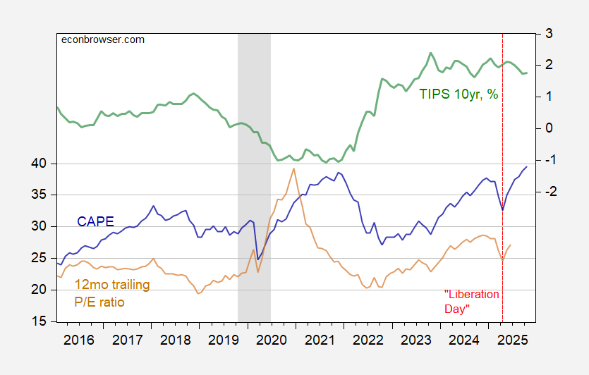 Figure 1: CAPE (blue, left scale), P/E ratio, 12 mo trailing earnings (tan, left scale), and TIPS 10 yr yield, % (green, right scale). NBER defined peak-to-trough recession dates shaded gray. Source: Shiller, Treasury via FRED, NBER, and author’s calculations.