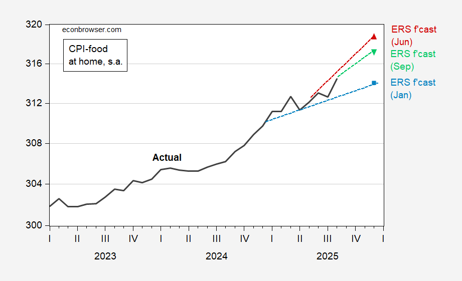 Figure 1: CPI for food at home (black), USDA Economic Research Service forecast from January (blue square), from June (red triangle), from September (green inverted triangle), on log scale. Source: BLS via FRED, ERS, author’s calculations.