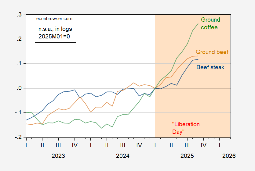 Figure 1: Beef steak price (blue), ground beef price (tan), ground coffee price (green), all nsa, in logs, 2025M01=0. Source: BLS via FRED, and author’s calculations.