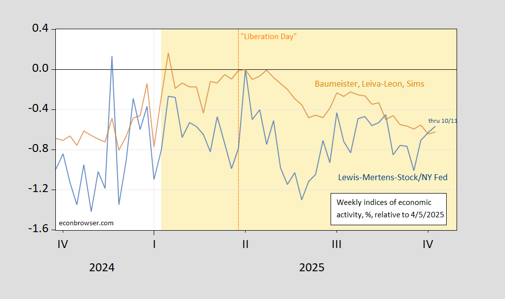 Figure 2: Lewis-Mertens-Stock Weekly Economic Index (blue), and Baumeister-Leiva-Leon-Sims Weekly Economic Conditions Index for US (tan), all y/y growth rate in %, relative to 4/5/2025. Source: FRED, WECI, accessed 10/16, and author’s calculations.