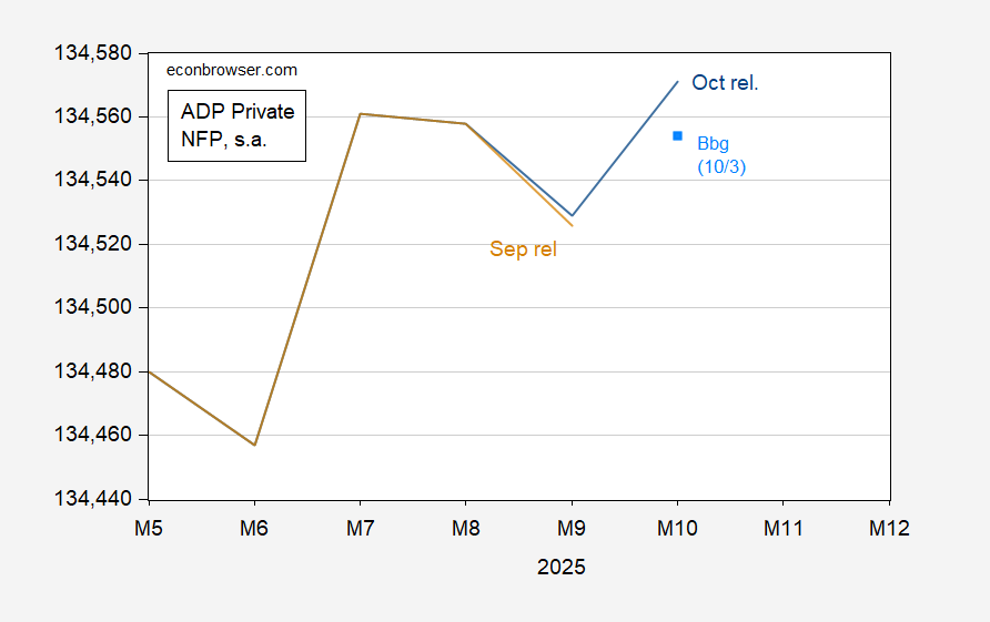 Figure 1: ADP private NFP, October release (blue), Bloomberg consensus of 10/3 (light blue square), September release (tan), all in 000’s. Source: ADP-Stanford Digital Economy Lab via FRED, Bloomberg, and author’s calculations.