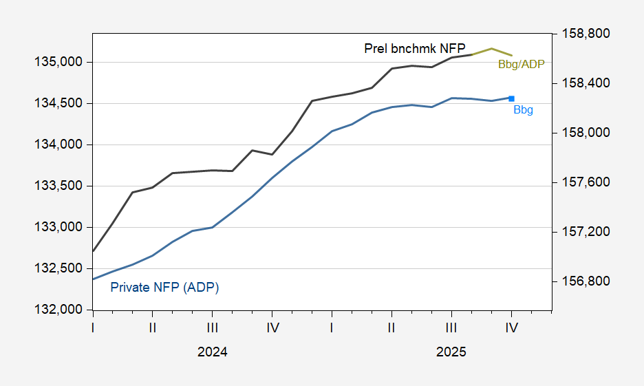 Figure 2: ADP Private nonfarm payroll employment (blue, left scale), Bloomberg consensus implied employment of 10/3 (light blue square, left scale); BLS benchmark-implied nonfarm payroll employment (black, right scale), implied NFP (chartreuse, right scale), all in 000’s, s.a. Source: ADP, BLS via FRED, and author’s calculations.