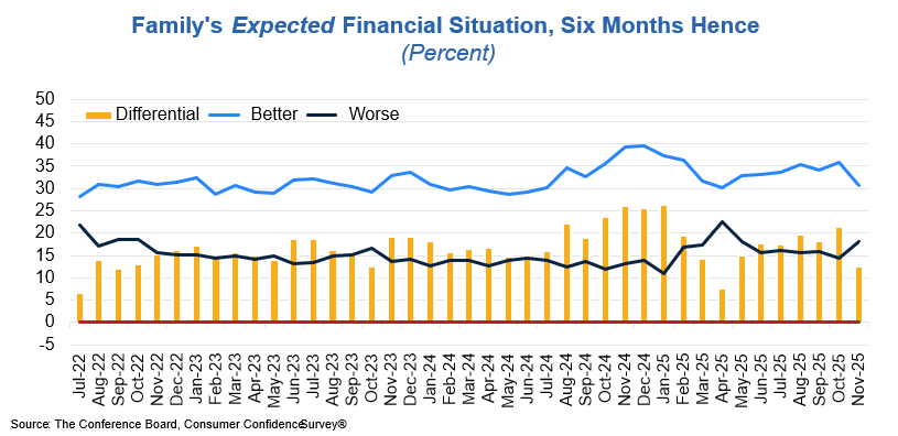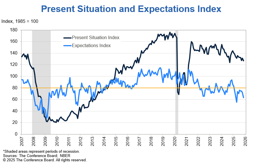 …All three components of the Expectations Index deteriorated in November. Consumers were notably more pessimistic about business conditions six months from now. Mid-2026 expectations for labor market conditions remained decidedly negative, and expectations for increased household incomes shrunk dramatically, after six months of strongly positive readings.”