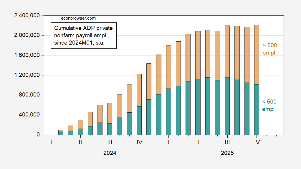 Figure 1: ADP cumulative employment since January 2024, for firms with employment less than 500 employees (teal bar), and 500 and greater employees (tan bar), s.a. Source: ADP via FRED and author’s calculations.
