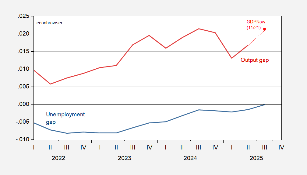 Figure 1: Unemployment gap (blue), and output gap (dark red), implied output gap using GDPNow (red square). Source: CBO (March), BEA, BLS via FRED, Atlanta Fed, and author’s calculations.