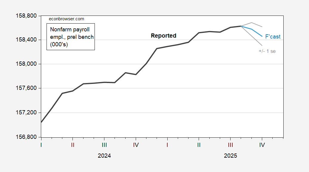 Figure 1: Implied preliminary benchmark revision nonfarm payroll series (bold black), forecast based on ADP private NFP (light blue), +/- 1 se band (gray lines), (both in 000’s, s.a. Private NFP estimated using 2022M01-25M08 regression [1]. NFP for 2025M09 uses 14K decrease in government employment, 150K DRP-related decrease in 2025M10 per Treasury. Standard error bands for private NFP only. Source: BLS, ADP and author’s calculations.