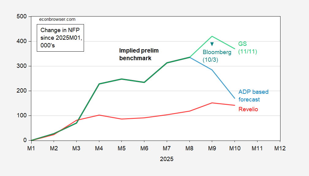 Figure 2: Implied preliminary benchmark revision nonfarm payroll series (bold black), forecast based on ADP private NFP (light blue), Bloomberg consensus of 10/3 (teal inverted triangle), Goldman Sachs (light green), and Revelio estimate (red), all in 000’s, s.a. Source: BLS, ADP, Bloomberg, Goldman Sachs (11/11), Revelio Labs (11/6), and author’s calculations.