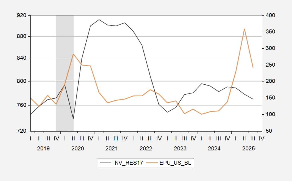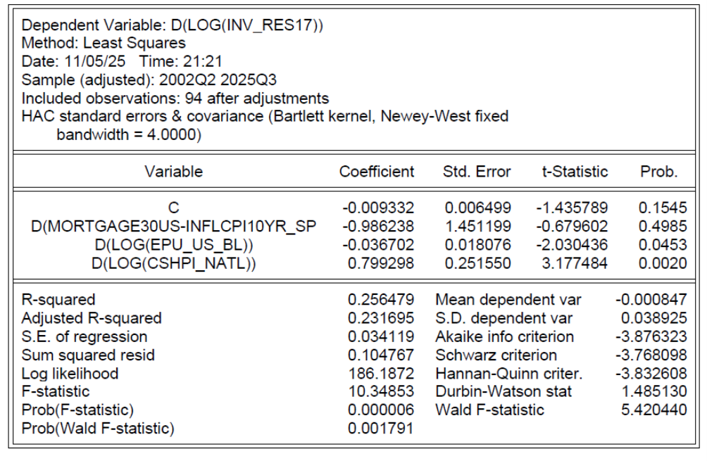 To verify this, I estimate a regression over the 2005-2025 period, in first differences, relating growth in real residential investment to changes in the real interest rate and EPU, and appreciation in house prices (from Case-Shiller national house price index).