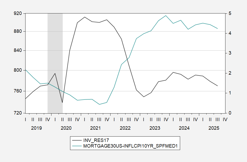 Figure 1: Real residential investment, in bn.Ch.2017$ SAAR (black, left scale), 30 year mortgage rate adjusted by 10 yr SPF median inflation, in % (blue, right scale). 2005-2012 data is in Ch.2012$, rescaled into Ch.2017$. Q3 real residential investment is nowcast from GDPNow. NBER defined peak-to-trough recession dates shaded gray. Source: BEA, Fannie Mae via FRED, Philadelphia Fed, NBER, and author’s calculations.