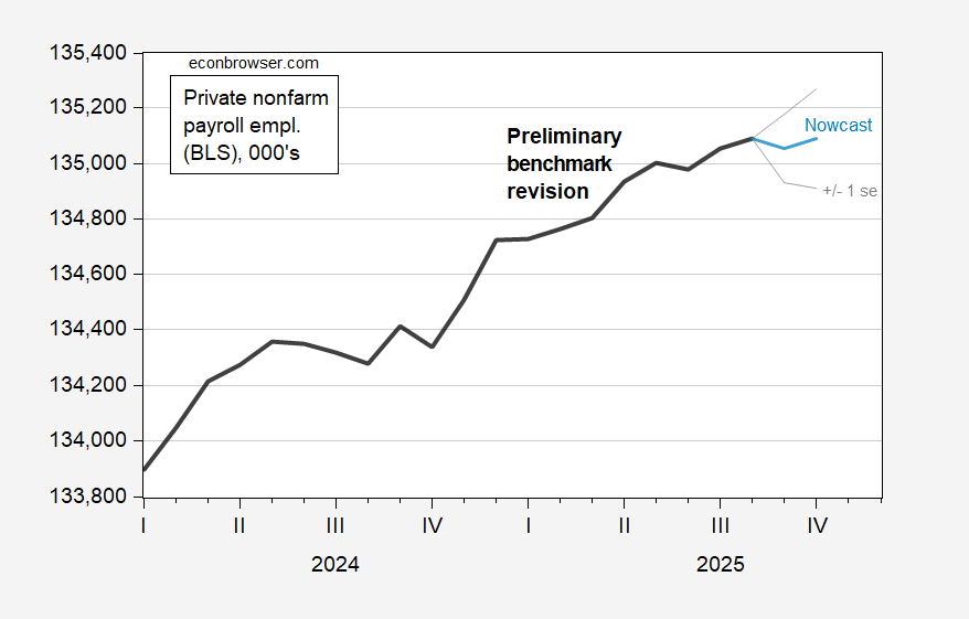 Using 2022M01-25M08 data on implied preliminary benchmark private employment, a regression on first log differences yields a unit coefficient, and adjusted R2 of 0.56, SER = 0.00087. The resulting nowcast is shown below.