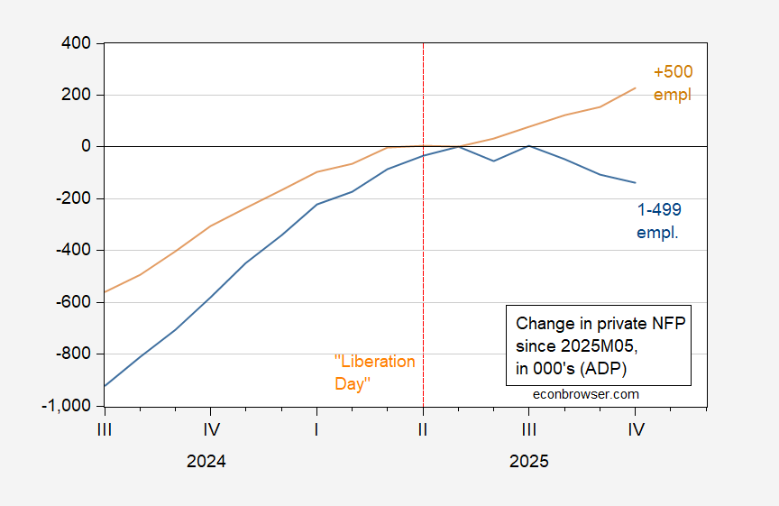 Figure 1: Change in employment from May 2025 in firms with less than 500 employees (blue), in firms with 500 and more employees (tan), both in 000’s, s.a. Source: ADP via FRED, and author’s calculations.