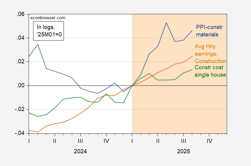 Figure 1: PPI for construction materials (blue), construction costs for single unit houses, Fisher index (tan), and average hourly earnings for construction workers (production and nonsupervisory) (green), all in logs, 2025M01=0. Source: BLS via FRED, BLS, Census, and author’s calculations.
