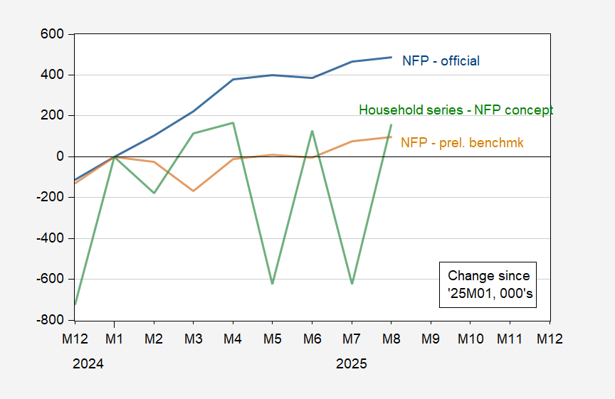 Antoni is a young’un so he can be excused for not realizing that the birth-death model, whatever its deficiencies at a given instant, can understate as well as overstate net job growth. Indeed, the creation of the research series adjusting the household employment series to the NFP concept can be understood as exactly the BLS response to the understatement critique. Here’s the discussion of the alternative series, and here is the data. As of today, here are official NFP, household series adjusted (as well as implied preliminary benchmark, which probably understates what the final benchmark will reveal):