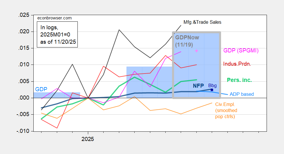 Figure 1: Implied NFP preliminary benchmark revision (bold blue), ADP based author’s estimate (light blue), Bloomberg consensus employment for implied preliminary benchmark, (blue square), civilian employment with smoothed population controls (bold orange), industrial production (red), personal income excluding current transfers in Ch.2017$ (bold light green), manufacturing and trade sales in Ch.2017$ (black), consumption in Ch.2017$ (light blue), and monthly GDP in Ch.2017$ (pink), estimate of monthly GDP based on coincident index (pink +), GDP (blue bars), GDP from GDPNow of 11/19 (blue bar, gray outline), all log normalized to 2025M04=0. Source: BLS via FRED, Federal Reserve, BEA 2025Q2 third release, Atlanta Fed, S&P Global Market Insights (nee Macroeconomic Advisers, IHS Markit) (9/2/2025 release), and author’s calculations.