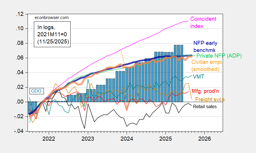 Figure 1: Implied Nonfarm Payroll early benchmark (NFP) (bold blue), civilian employment adjusted smoothed population controls (bold orange), manufacturing production (red), ADP private nonfarm payroll employment (green), real retail sales (black), vehicle miles traveled (tan), and coincident index in Ch.2017$ (pink), GDO (blue bars), all log normalized to 2021M11=0. Source: Philadelphia Fed [1], Philadelphia Fed [2], Bureau of Transportation Statistics, Federal Reserve via FRED, BEA 2025Q2 third release, and author’s calculations.