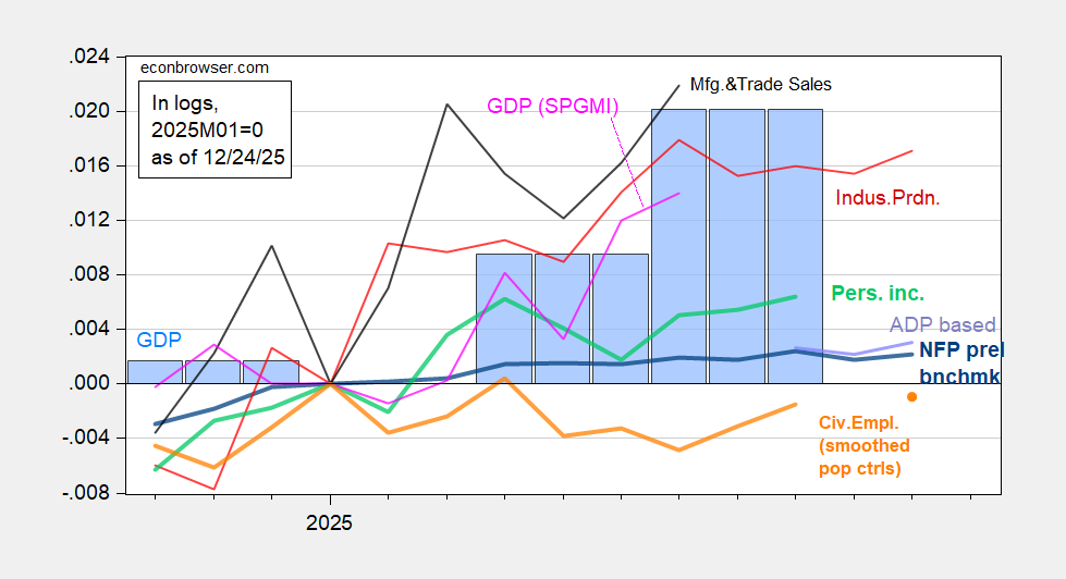 Figure 1: Nonfarm Payroll incl preliminary benchmark revision employment from CES (bold blue), implied NFP from ADP plus estimates for government employment (lilac), experimental civilian employment using smoothed population controls (orange), industrial production (red), personal income excluding current transfers in Ch.2017$ (bold light green), manufacturing and trade sales in Ch.2017$ (black), consumption in Ch.2017$ (light blue), and monthly GDP in Ch.2017$ (pink), GDP (blue bars), all log normalized to 2021M11=0. Source: BLS via FRED, Federal Reserve, BEA 2025Q3 initial release, S&P Global Market Insights (nee Macroeconomic Advisers, IHS Markit) (9/2/2025 release), and author’s calculations.