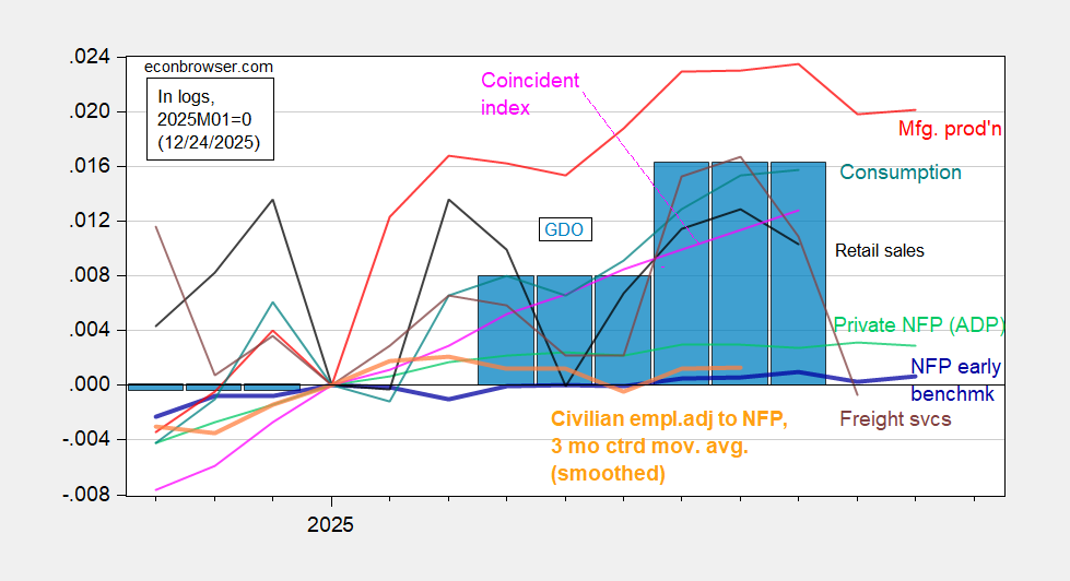 Figure 2: Implied Nonfarm Payroll early benchmark (NFP) (bold blue), civilian employment adjusted to NFP concept, smoothed population controls and 3 month centered moving average (bold orange), manufacturing production (red), personal income excluding current transfers in Ch.2017$ (bold green), real retail sales (black), freight services index (brown), and coincident index in Ch.2017$ (pink), GDO (blue bars), all log normalized to 2021M11=0. Source: Philadelphia Fed [1], Philadelphia Fed [2], Federal Reserve, BTS via FRED, BEA 2025Q3 initial release, and author’s calculations.