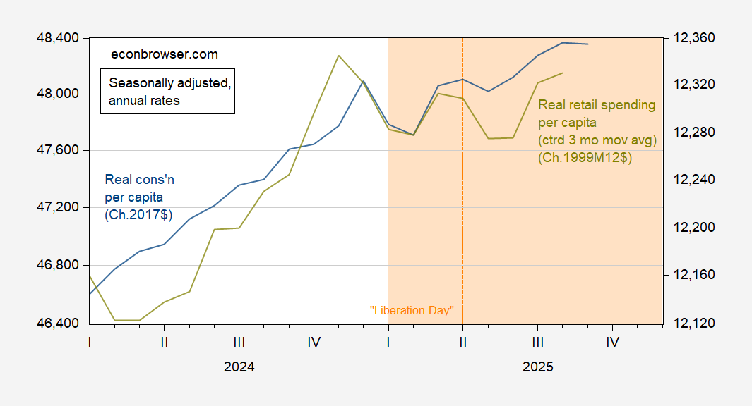 Figure 2: Real consumption per capita, in Ch.2017$ SAAR (blue, left log scale), real retail sales per capita, in Ch.1999M12$ (chartreuse, right log scale). Retail sales series deflated using chained CPI, seasonally adjusted by author using X-13. FRED population series POPTHM used to calculate per capita series. Source: BEA , BLS via FRED, and author’s calculations.
