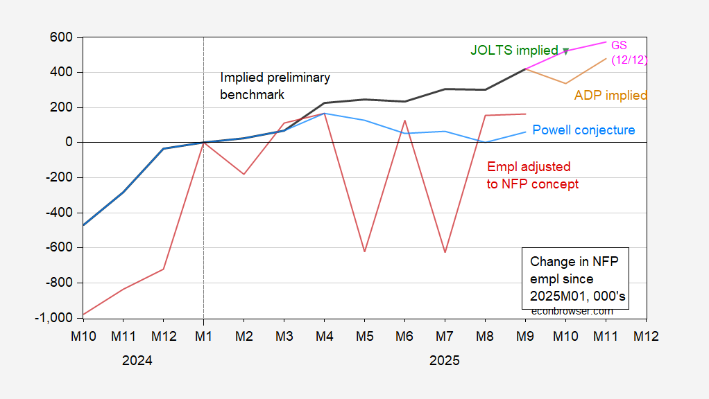 Figure 1: Change in implied benchmark revision since Janaury 2025 (bold black), Goldman Sachs 12/12 (pink), JOLTS implied (inverted green triangle), ADP implied (tan), Powell conjecture (light blue), and CPS employment series adjusted to NFP concept, smoothed population controls (red), all in 000’s. Source: BLS via FRED, BLS, ADP and author’s calculations, Paweł Skrzypczyński.