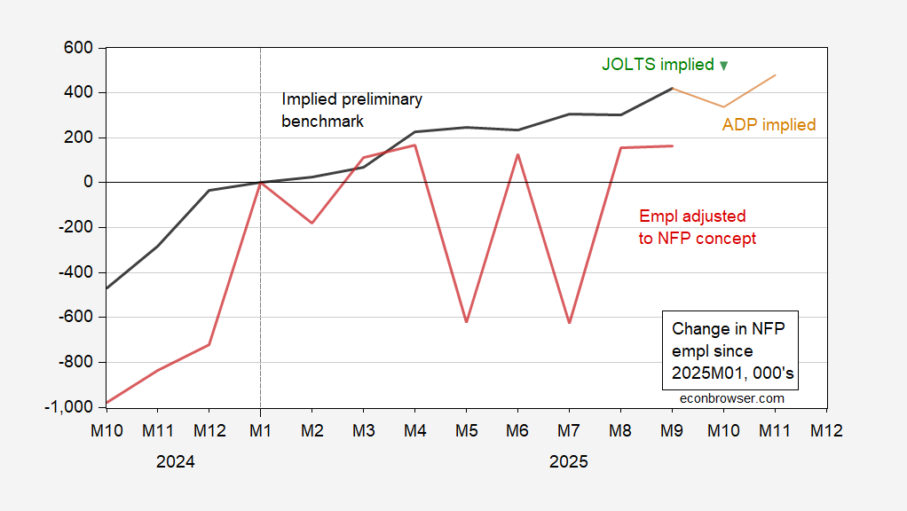 My estimates based on ADP, JOLTS based estimate (courtesy Paweł Skrzypczyński). Delayed CES report on 12/16 (coming out with November release).