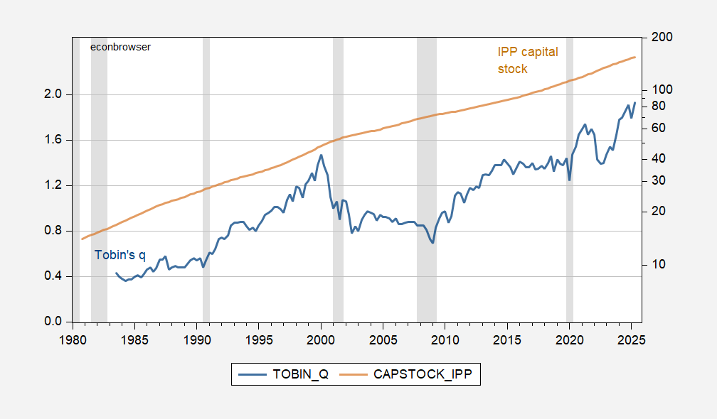 In 2025Q2, detrended q is then lower than it was in 2000Q1 (1.35 vs. 1.54). I’d like to say this means the market’s valuation of the capital stock is not excessively high, but in actuality detrending using log stock of IPP is pretty close to linear (deterministic) detrending, and this is a dangerous thing to do when q looks like an I(1) process (one can’t reject the null hypothesis of unit root).