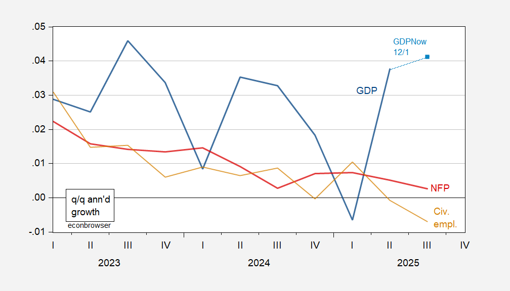 Employment seems to be growing very slowly, if not shrinking, while output (measured with lots of noise) seems to be rising, into Q3. Would NBER ever determine a recession occurred when GDP was rising?