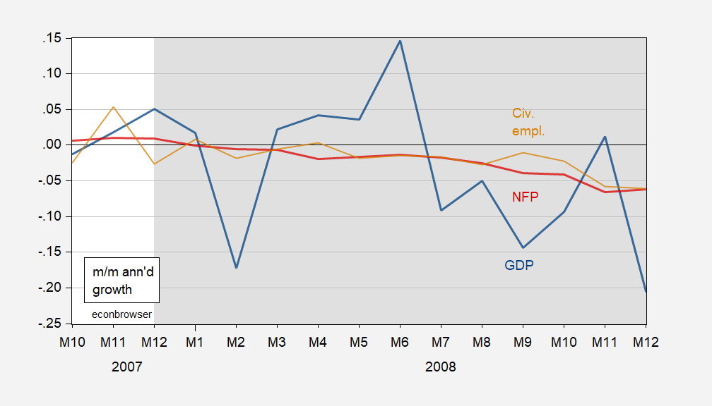 At the monthly frequency (going back to 1992 using Macroeconomic Advisers/SPGMI series), one finds the 2008-09 recession has NFP employment growth negative from 2008M01 onward, while monthly GDP growth is negative in 2008M02, and then 2008M07 onward.