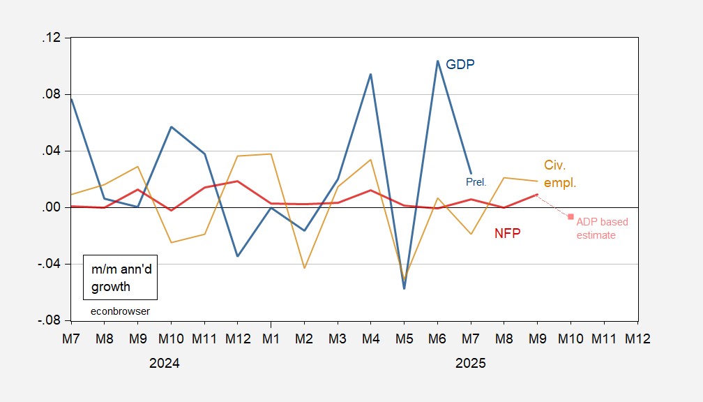 Figure 3: Month-on-Month annualized growth rate of monthly GDP (bold blue), nonfarm payroll employment, implied preliminary benchmark (red), nowcasted NFP (pink square), and civilian employment (tan). Source: BLS via FRED, S&P Global Market Insights (nee Macroeconomic Advisers, IHS Markit) (9/2/2025 release), and author’s calculations.