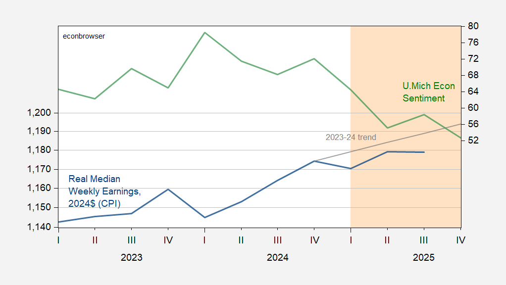 Figure 2: Real median weekly earnings, deflated by CPI-all (blue, eft log scale), 2023-24 stochastic trend (gray), and U.Michigan Consumer Sentiment (green, right scale). Source: BLS via FRED, U.Michigan Survey of Consumers, and author’s calculations.