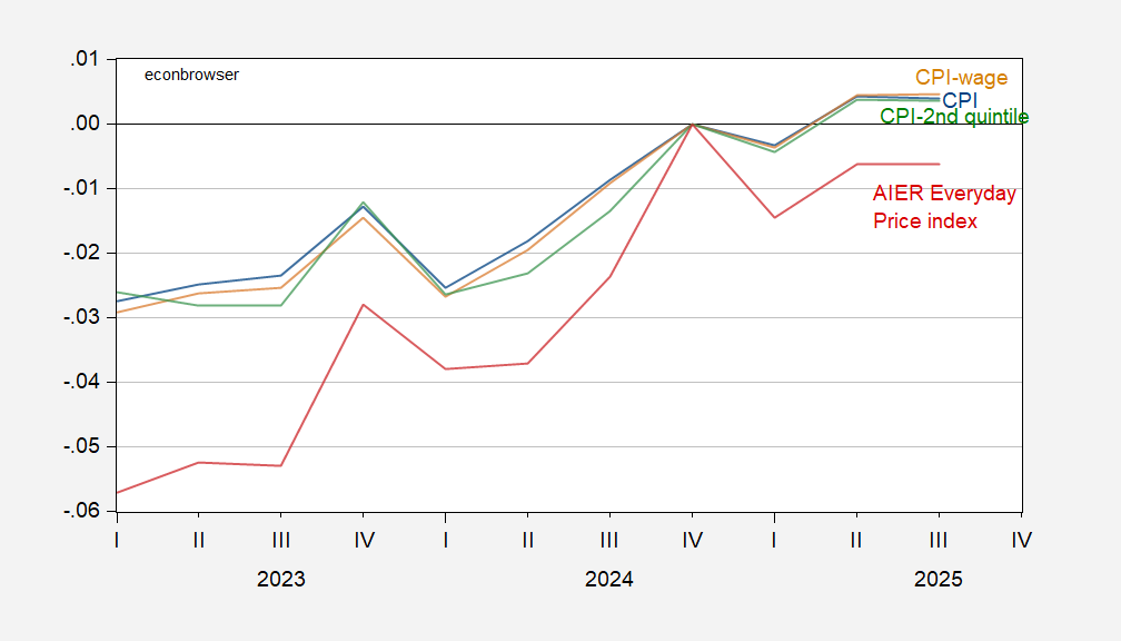 Figure 1: Real median weekly earnings, deflated by CPI-all (blue), by CPI-wage earners & clerical workers (tan) by CPI second quintile (green), and by AIER Everyday Price Index (AIER EPI) (red), all in logs, 2024Q4=0. 2025 Second quintile CPI extrapolated using regression first differences CPI 2023-24. Source: BLS via FRED, BLS, AIER, and author’s calculations.