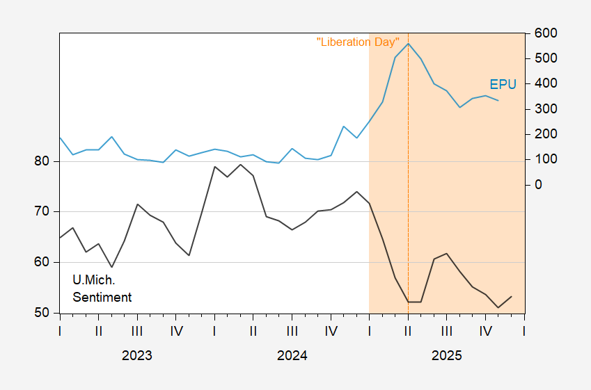 Figure 3: U.Michigan Consumer Sentiment (black, left scale), EPU (news) (blue, right scale). Source: U.Mich. via FRED, policyuncertainty.com.