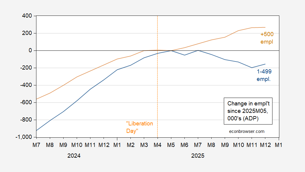 Figure 3: Cumulative change since 2025M04 in employment in firms with employment > 500 (tan), employment 1-499 (blue), in 000’s, s.a. Source: ADP, and author’s calculations.