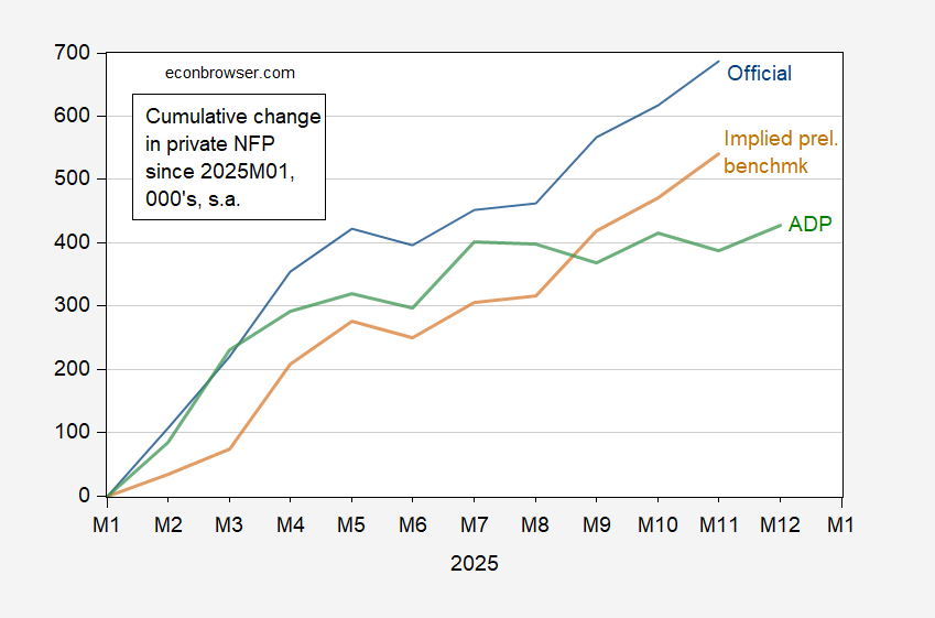 Figure 1: Change since January 2025 in private nonfarm payroll employment, BLS official (blue), implied preliminary benchmark BLS private NFP (brown), and ADP private NFP (green), all in 000’s, s.a. Source: BLS, ADP via FRED, BLS, and author’s calculations.