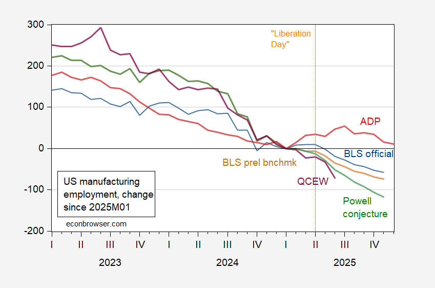 Figure 4: Change since 2025M01 in manufacturing employment from BLS (blue), from implied preliminary benchmark (brown), in Powell conjecture prorated applied to implied preliminary benchmark (green), QCEW covered manufacturing seasonally adjusted using X-13 (in logs) by author (purple), and ADP (red), all in 000’s, s.a. Source: BLS via FRED, BLS, ADP, and author’s calculations.