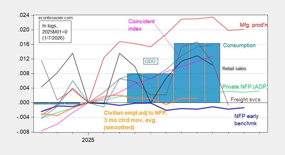 Figure 2: Implied Nonfarm Payroll early benchmark (NFP) (bold blue), civilian employment adjusted to NFP concept, smoothed population controls and 3 month centered moving average (bold orange), manufacturing production (red), consumption in Ch.2017$ (teal), real retail sales (black), freight services index (brown), and coincident index in Ch.2017$ (pink), GDO (blue bars), all log normalized to 2025M01=0. Source: Philadelphia Fed [1], Philadelphia Fed [2], Federal Reserve, BTS via FRED, BEA 2025Q3 initial release, and author’s calculations.