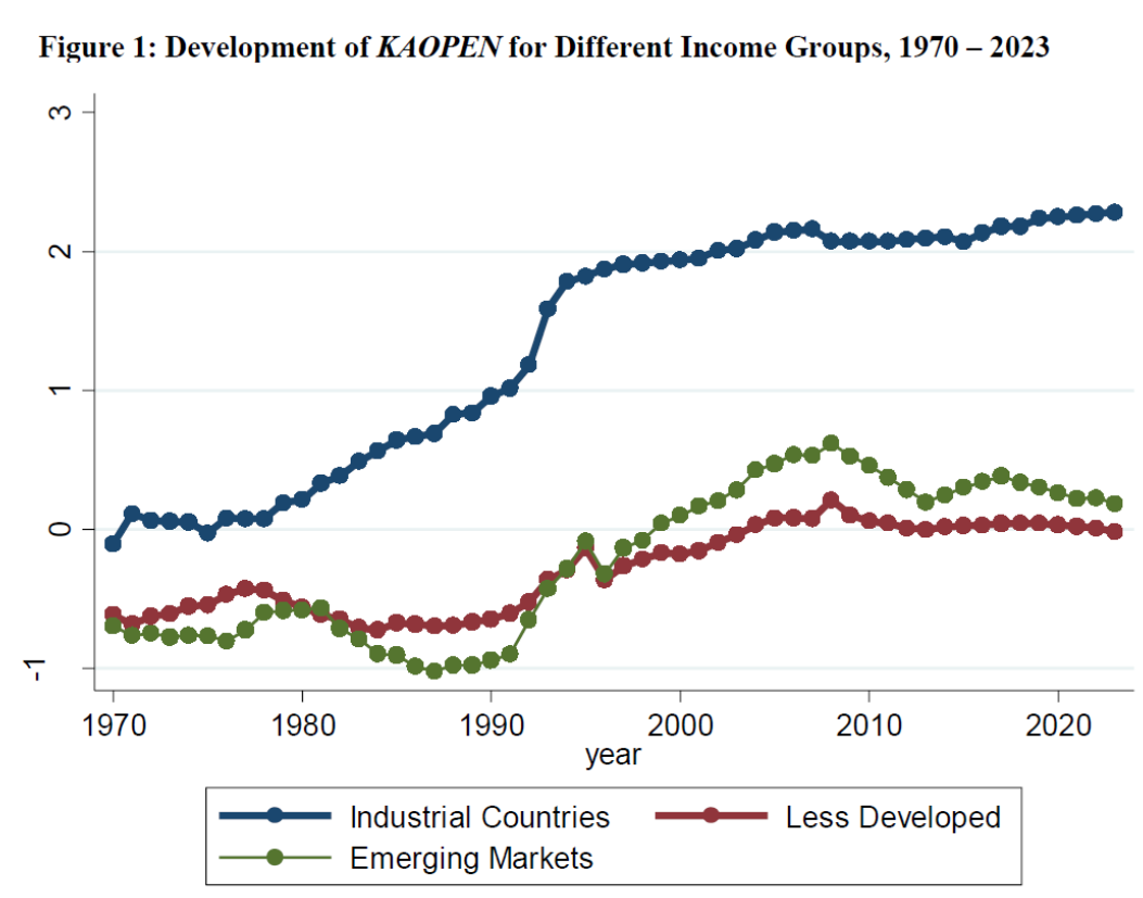 Hiro Ito and I constructed the index because there were few, widely available and consistently updated measures of financial openness at the time, with the exception of Quinn’s (APSR, 1997) measure, which at the time was more limited in coverage. Individual dummy variables based on the IMF’s (old) de jure classification of controls (on exchange rates, export proceeds, capital account, current account) didn’t prove informative in one of my early empirical analyses of financial development (Chinn, 2004, ungated version here). The Chinn-Ito index, based on the aforementioned IMF de jure classifications, was converted into a single index using by taking the first principal component (essentially — the capital account component is smoothed), and was developed for a project to assess how financial openness correlates with financial development, published in JDE (2006) (with lots of help from friends, including Ashok Mody, Antu Panini Murshid).