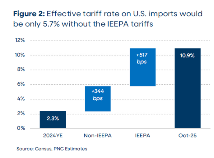 According to PNC Financial Services Economic Research, eliminating the IEEPA tariffs would at least in the short term reduce the realized effective tariff rate: