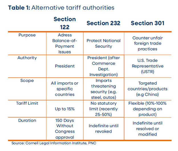 Certain commentators (e.g. Heritage Foundation) have argued that a Supreme Court strikedown would not change overall tariff levels, as Trump could implement tariffs under different authorities. Here is a tabulation of the other trade authorities.