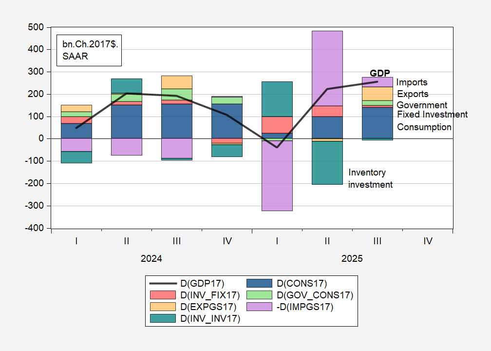 Figure 1: Change in GDP (bold black line), change accounted for by Consumption (dark blue bar), Fixed investment (red bar), Inventory investment (teal bar), government consumption and investment (light green bar), exports of goods and services (orange bar) and imports (lilac bar), all in bn.Ch.2017$ SAAR. Source: BEA 2025Q3 updated release, and author’s calculations.